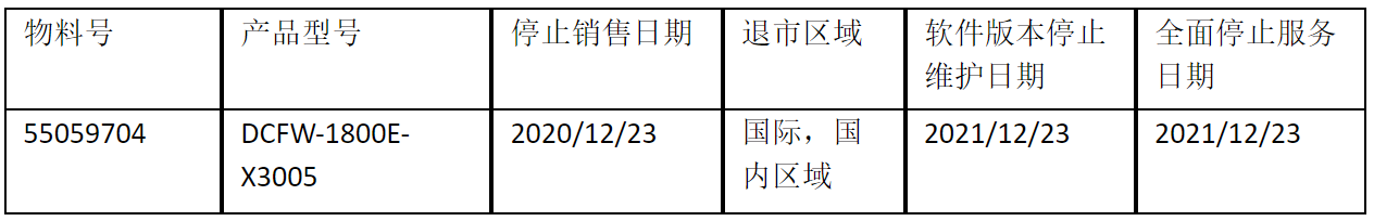 北京神州数码15vip太阳信息技术有限公司正式通知您, 以上DCFW-1800E-X3005下一代防火墙(55059704)将于20201223号停止接收新的订单(具体日期见上表),不再供货。给您带来的不便,敬请原谅。