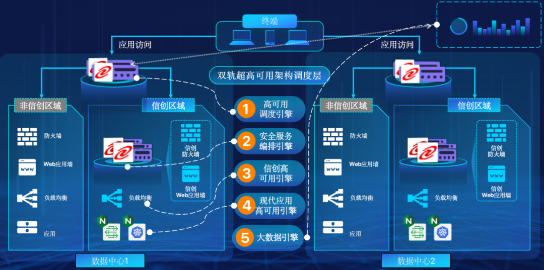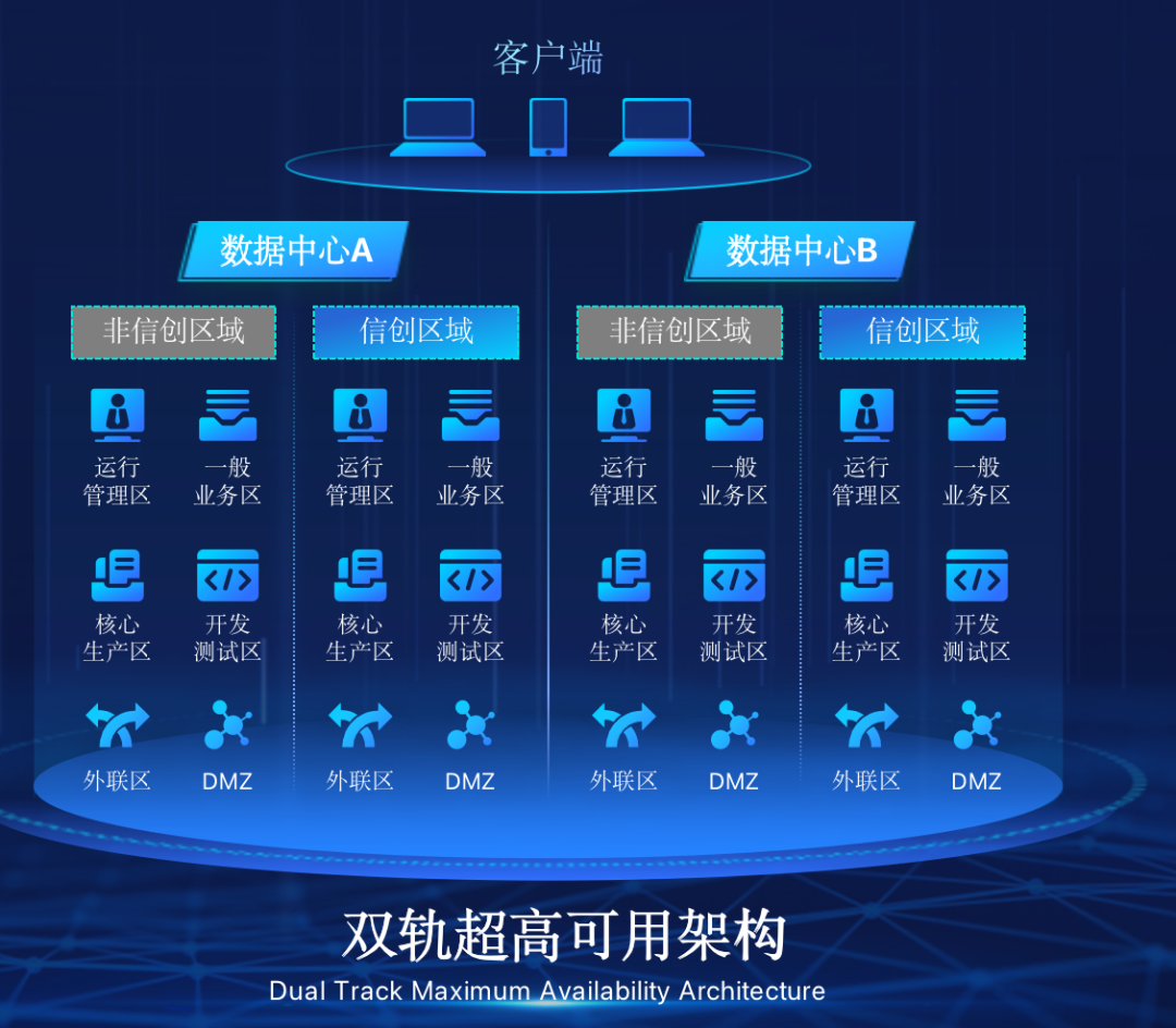 神州15vip太阳在企业面临自主创新IT基础重构过程中,推出的全新架构双轨超高可用架构(简称DTMAA),在双活数据中心的分区调度基础上,添加每个数据中心内信创域和非信创域的分域调度,来实现分区分域协同的多活双轨超高可用。
