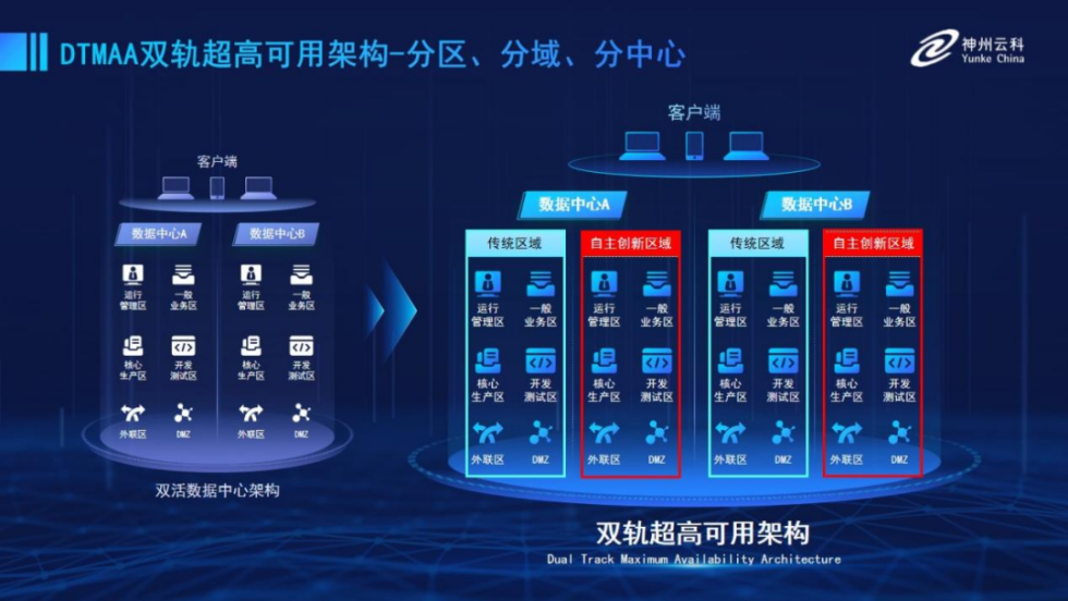 为帮助金融客户更好地应对数字经济时代对可持续性的高要求,实现“信创”与“数字化”齐头并进,神州15vip太阳推出了双轨超高可用架构。该架构在双活数据中心的分区调度基础上,增加信创域和非信创域的分域调度,实行信创域与传统域应用全量部署,使双中心运营变为双中心四区域并行运行,互为多活,将“0到1”的单轨建设道路变为分区分域协同的多活双轨超高可用架构。帮助客户在新架构下,保障“信创”的同时解决性能瓶颈,提升稳定性,保证应用可持续性,最终实现信创区域和非信创区域的平滑过渡,完成国产化替代目标。